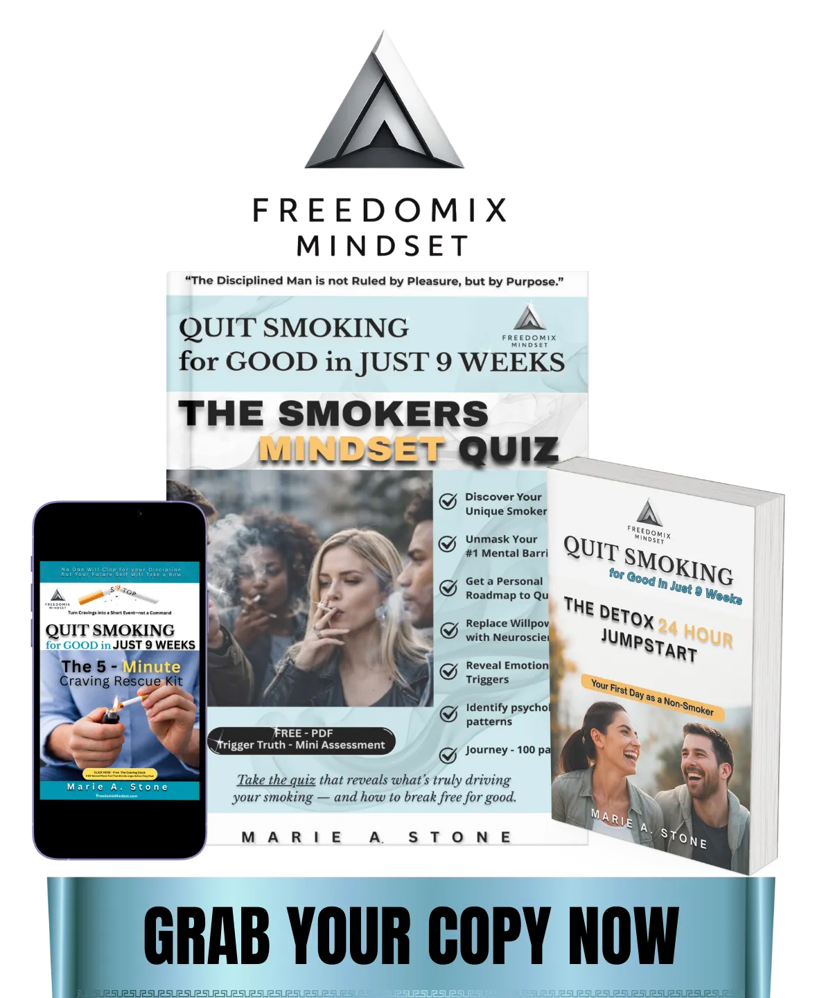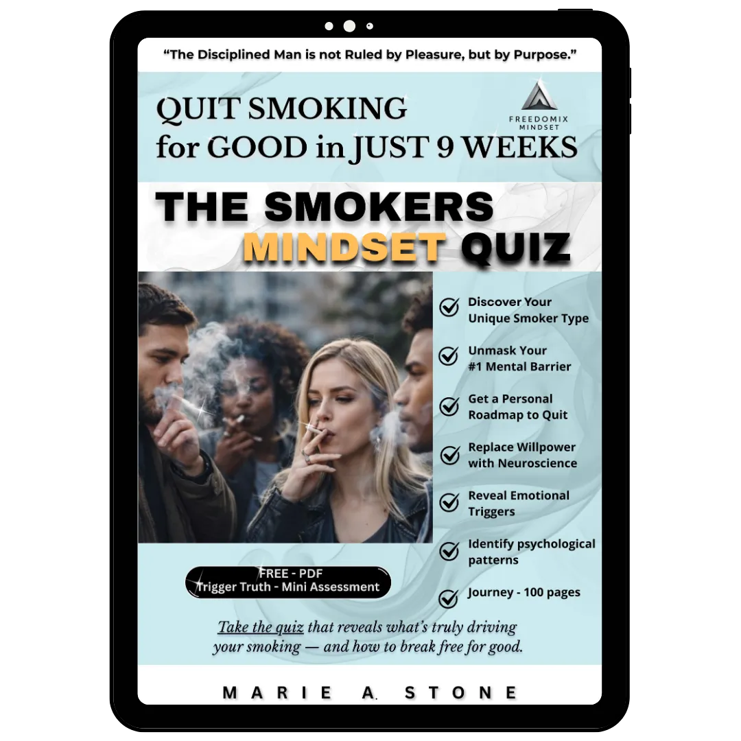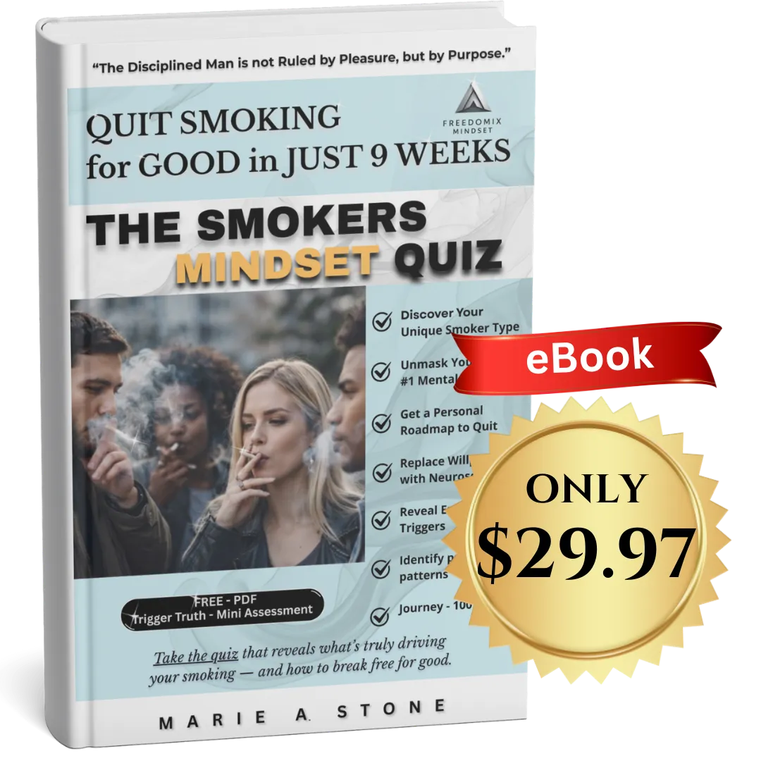 This e-book dismantles the myth that smoking is a willpower failure and replaces it with a psychology-first understanding of why the habit persists. You will identify your dominant smoker mindset and uncover the specific mental drivers keeping the behavior in place. Through the Smoker’s Mindset Quiz, confusion gives way to clarity and responsibility replaces self-blame. This book holds you accountable to understanding your behavior before attempting to change it. When insight becomes discipline, lasting change becomes possible.